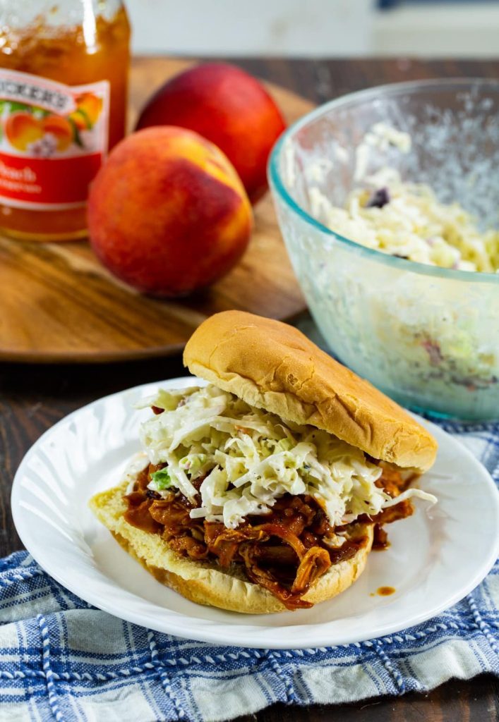 My favorite way to serve Slow Cooker BBQ Peach Pulled Chicken is on a bun with creamy coleslaw, but it also makes a great filling for tacos and burritos.